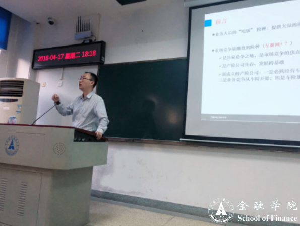 (学生记者 仰巧巧)4月17日下午,太平财险湖北分公司车险部总经理、保险专业合作硕导武景涛先生应邀在文泰楼205教室为保险学子授课。本次讲座的主题是“车险经营管理实务”,讲座由金融学院保险系余洋副教授主持。