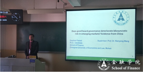 我院金融学留学博士生Zeeshan Fareed(华泽山或几桑)撰写的论文“良好的公司治理消减了新兴市场上的异质风险吗:来自中国的证据”(Does good board governance deteriorate idiosyncratic risk in emerging markets? Evidence from China)入选本次论坛,并应邀参会。在11月3日的博士研究生论坛上,华泽山扼要报告了论文,听取专家评议,回答现场提问。在会议期间,他还参加了财政、税收与公共经济学的多场学术报告。