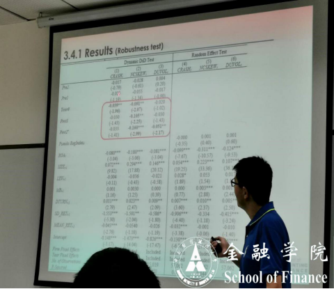 讲座的最后,王老师还指出该模型存在的些许不足,比如模型尚未考虑银行竞争和盈余管理的共同影响,股价崩塌风险的滞后一期是否应该加入模型中,是否应该考虑借贷公司有过借款历史和跨州借贷问题等,而这些具体影响还需进一步进行研究。同学们也在王老师讲完后的自由提问环节踊跃发言,与王老师进行交流,王老师也耐心地为同学们一一解答。