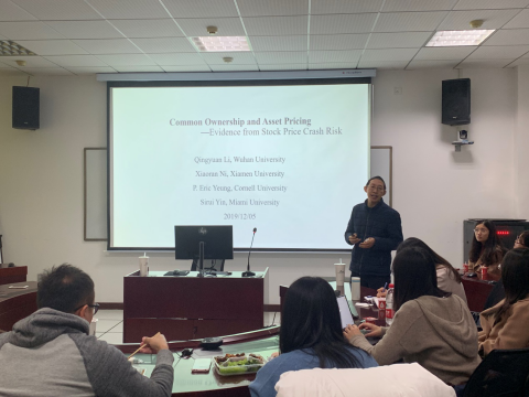 (学生记者 王动)2019年12月5日中午十二点,我院“文澜金融论坛”第159期在文泉楼南106会议室顺利举行。本期文澜金融论坛邀请到的主讲嘉宾为武汉大学经济与管理学院李青原教授,本期讲座的主题为“机构共同持股与公司股价崩盘风险”, 金融学院副院长吕勇斌教授、肖春海副教授、杨巧副教授、杨璐副教授、吴震星博士、王亚男博士、王琴博士等教师及学院多名本科生、研究生参会。讲座由院长余明桂教授主持。
