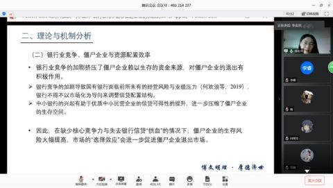 论坛分为两个环节,首先由主讲人李金洋开始就个人研究成果进行汇报。李金洋同学通过我国推行一系列以市场化为导向的银行业改革,致使银行业竞争水平大大提高的现象,引出文章的主题:银行业竞争能够促进企业的优胜劣汰吗?此外,李金洋同学阐述了文章的理论与机制、数据来源、模型设定等具体内容,她选取了1998年-2013年的中国工业企业数据与金融机构营业网点数据,并结合微观层面的数据,从企业退出的视角考察了银行业竞争通过优化信贷资源配给所发挥的优胜劣汰作用。研究发现银行业竞争能够显著提高企业的融资能力,从而降低其退出概率,这种作用在非国有、东部城市和绩效水平高的优质企业中表现的更为明显;同时,银行业竞争也显著提升了城市层面的资源配置效率,促进僵尸企业退出市场,尤其是增加了国有僵尸企业的退出概率。