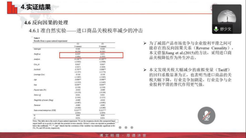 讲人舒少文首先就个人研究成果进行汇报。突出介绍我国上市公司股利调整较快的现实背景和基于代理结果理论和代理替代理论的理论背景,并提出研究问题:产品市场竞争对企业股利平滑的影响。然后以我国沪深两市A股上市企业2004-2018的年度数据为样本,运用实证模型从两类代理理论的视角研究产品市场竞争对企业股利平滑的影响。回归结果显示,产品市场竞争与企业股利平滑存在显著负相关关系,即表明产品市场竞争会导致企业股利不平滑,结论支持“代理替代模型”。文章还基于投资者保护程度的不同,解释了我国产品市场竞争与股利平滑替代的现象。另外还研究了产品市场竞争的治理效应与公司治理机制对股利平滑的相互影响,发现产品市场竞争能够替代分析师关注和股权制衡对股利平滑的正向影响,从而使股利平滑度下降。