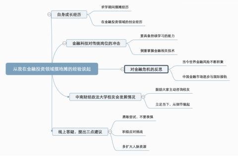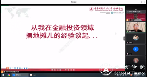 讲座主题为“从我在金融投资领域摆地摊的经验谈起”,杨健校友娓娓道来,畅谈了在金融投资行业的生存之道;以及金融科技趋势下,金融学子的应对之道;和同学们交流了金融校友会及校外导师进课堂的一些经验。参与本期讲座有在校学生、老师以及校友们。