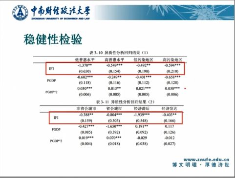 汇报环节,首先付宇介绍了文章的研究背景和选题意义,认为中国普惠金融更关注扶贫、促进农村和中小微企业发展等,对其绿色价值关注度不高。但有文献研究认为普惠金融是能发挥绿色价值的,所以文章创新的将普惠金融和雾霾污染联系起来。其次从普惠金融发展对雾霾污染的抑制作用、环境库兹涅茨曲线假说成立性和稳健性提出假设。接着通过基准回归说明普惠金融是对雾霾污染是具有显著抑制作用的,内生性问题的处理上通过划分中西部和东部进行双重差分回归。机制分析表明普惠金融通过影响消费、产业结构、能耗结构和银行结构来影响雾霾污染。最后得出结论:普惠金融发展与雾霾污染呈现显著的负相关关系。