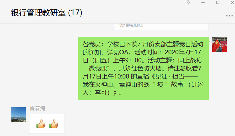(通讯员 吕勇斌)按照中组部《“党课开讲啦”活动工作方案》和教育部《在常态化疫情防控中加强高校基层党建“四个一”行动方案》等工作部署,7月17日上午,银行管理教研室党支部通过腾讯会议方式开展七月份“支部主题党日”活动。支部书记吕勇斌主持。