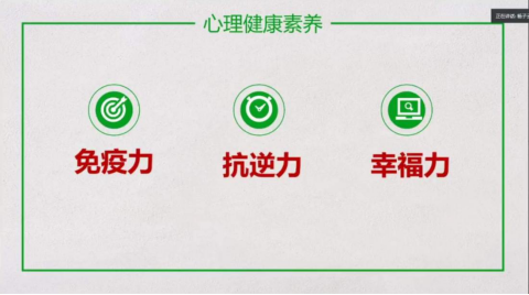 在第二部分,杨教授从免疫力、抗逆力、幸福力三个方面切入,展开描述了该如何提升心理素养能力。杨教授谈到,免疫力是维护积极心态的重要因素,适当学习心理学知识,能够提升人对消极情绪的免疫力。抗逆力则是从逆境中复原的能力,在日常生活中,人们难免会遇到这样那样的压力。要做到和压力良好相处、管理压力,就要培养抗逆力。幸福力则是指发现幸福、创造幸福的能力,主要从维持积极情绪体验、提高生活满意度、寻找人生意义感三个方面发挥作用。