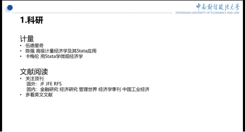 张馨月师姐熟悉Stata、Python等软件的应用,她从科研、上课、生活三个方面进行了经验分享,带领大家熟悉数据库的检索,鼓励大家关注和学习一些公众号的学习资源。还特别地展示了她三个学期的课表和并以“fake it till you make it”勉励各位同学。