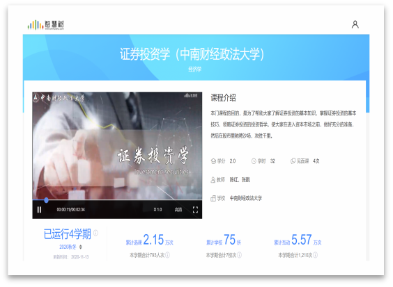本课程线上资源:《证券投资学》混合式共享学分课程,在线授课视频51个,共时长630分钟;教学内容分为股票、债券、基金、衍生金融工具、基本分析、技术分析六个模块,并设计4次线上见面课,全面讲授证券投资学的基础理论知识和投资技巧。《证券投资学》慕课自2018年上线以来,总选课人数超过5万人,在智慧树平台上为75所高校的2万多名学生提供了学分课,教学效果良好。本课程2020年入选“智慧树网本科高校专业课程TOP100”课程,获得了“东西部高校共享联盟”的高度评价。