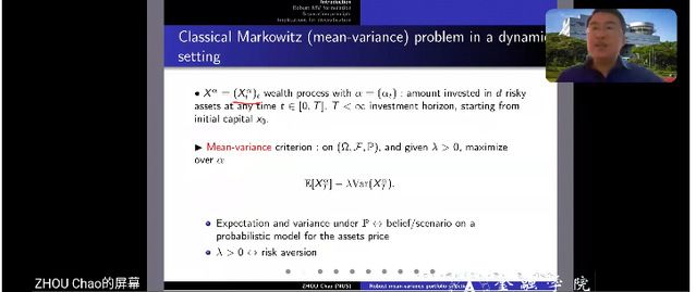 接着,周超研究员介绍了模型不确定条件下的多资产均值-方差投资组合选择问题。他系统地解释了模型不确定的含义、风险产生原因及其带来的影响等。在他的研究中,建立了一个连续时间模型,用于考虑预期收益率和相关矩阵的模糊规避,以及其对投资组合多样化的影响。研究证明,关联鲁棒控制问题的分离原理可以允许将最优动态策略的确定减少到最小风险溢价函数的参数计算。该原理的应用为最优投资策略提供了依据,并有效解释了经济学中的投资组合多样化不充分问题。报告结束后,周超研究员与线上同学进行了互动交流,并针对相关提问做出了详细解答。