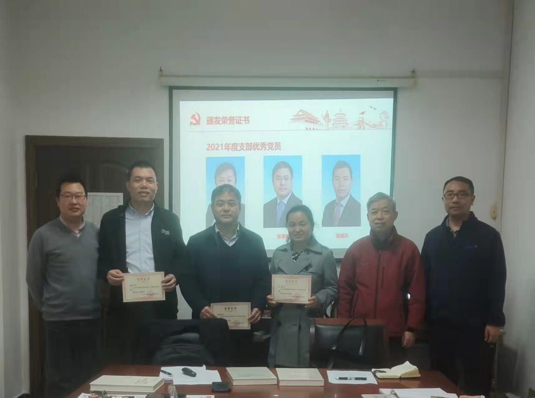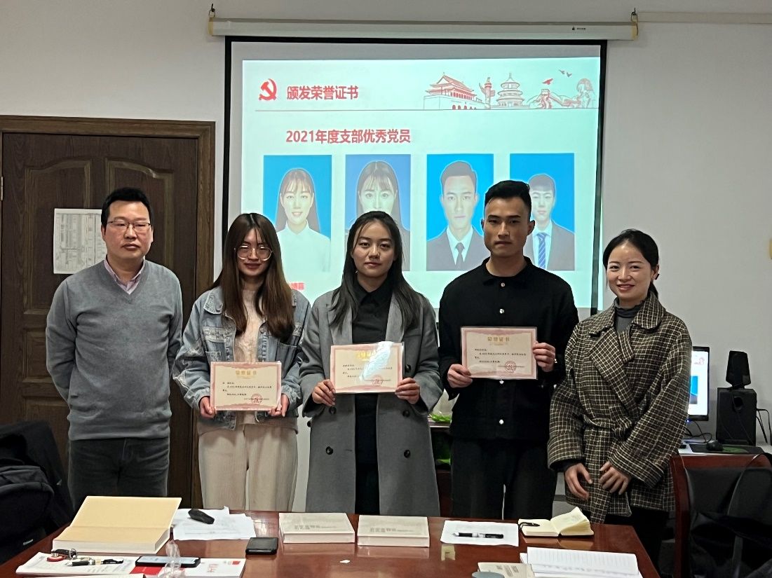 宣誓完毕之后,在热烈的掌声中,教师支部书记吕勇斌、特邀党员代表陈彩虹、教师党员代表冀志斌向教师支部2021年度优秀共产党员宋清华、陈雄兵、黄彬颁发了荣誉证书,随后教师支部书记吕勇斌、金融学院辅导员范媛向学生支部2021年度优秀共产党员李婧菲、汪静、田乾沛颁发了荣誉证书。