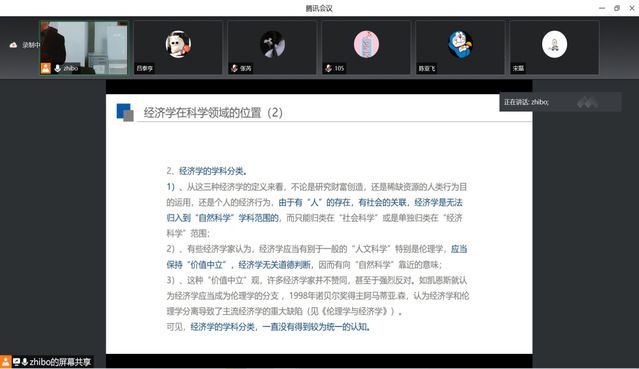 讲座上,陈教授还讲解了经济学在科学领域的位置。人类把握世界的四大领域-哲学、科学、文化和宗教。四大领域又具有不同的特点,哲学从整体上认知把握世界和人。马克思的说法“人是一切社会关系的总和”,适用于非常广阔的历史时空。其次概括了经济学的三大主要概念,经济学是研究财富创造的学说、如何用稀缺资源满足人欲望的科学、研究人类行为产生出经济后果的学说。并深入讲解了经济学定性研究的三个方面:一是经济现象;二是经济问题;三是经济行为。经济学定性研究三件事,为下定义、作判断、得结论。最后运用三个例子,理性经济人学说、古典经济学的货币理论和委托代理理论,阐述了定性研究和定量研究的关系。并提出三点总结:经济学定性研究必不可少;经济学定性研究是定量研究的基础;如果要成为经济学大家,定性研究是必须要走的路。