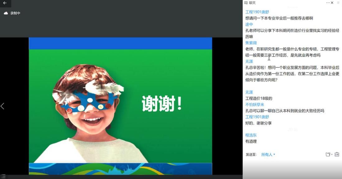 在最后的答疑环节中,与会学子积极提问,围绕个人能力提升、实习就业、职业规划、考研考证等方面提出了具有代表性的问题。孔小华总经理则回顾自身学习就业经历,并结合自己对造价行业的观察与感悟做出了专业解答,他提醒同学们结合市场经济现状找到清晰的发展方向,选择专业对口的工作,并鼓励同学们在本科期间积累知识,打下基础,培养开放自信的心态。