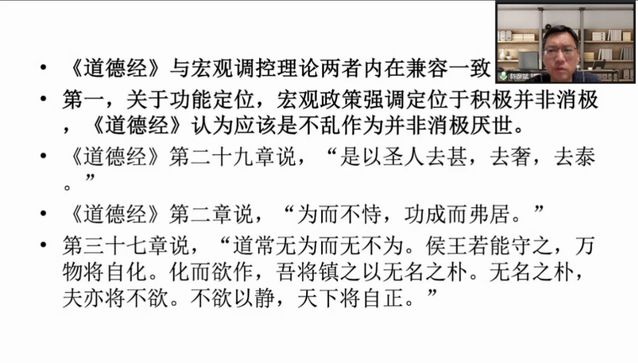 陈彦斌教授提出了中国特色宏观调控改革总体思路的两大原则,一要通过吸收中华传统文化来强调中国特色宏观调控的“中国特色”,二要通过构建宏观政策三策合一理论框架来强调中国特色宏观调控的“一般性”,并进一步引出了中华优秀传统文化和人类文明的瑰宝——《道德经》。
