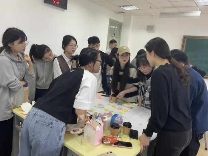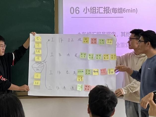 在此环节中,将世界咖啡会议的主题设定为“职场新人如何快速站稳脚跟?”活动开始前,教室的桌椅已提前分为四组,贴上了保险组、大金融组、互联网组和国企政府组四个桌签,桌面上摆好了咖啡与甜点,教室里充满了开放与轻松的氛围。在主持人介绍完活动目的与流程后,根据职业规划所划分的四个小组针对主题进行框架搭,利用大白纸和便利贴记录不同的观点,随后小组之间依次进行流动,对别组的观点进行反驳或补充。主持人、组长与记录员各司其职,教师随机参加各组讨论。整个会场气氛热烈却又次序井然。头脑风暴过后,各组再次凝练总结观点,并进行汇报展示。保险组、大金融组、互联网组和国企政府组的分析逻辑各有特点,创新观点层出不穷,大白纸+便利贴的思维画布新颖别致,充分的体现了世界咖啡会议的开放性与创新性。