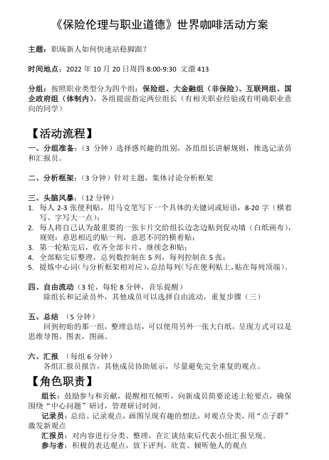 这是研究生课程《保险伦理与职业道德》结课调查中的匿名评价。同学们普遍认为,这门课程在课程内容和教学方式上有较大的创新,参与课程学习对于提升同学们的政治认同、职业规范、诚信与法治意识、职业素养等方面成效显著。特别是最后一次课程创新性地采用“世界咖啡会议+职业礼仪讲座”的教学形式,围绕“职业素养”进行课程设计,得到了同学们的热烈反响与一致好