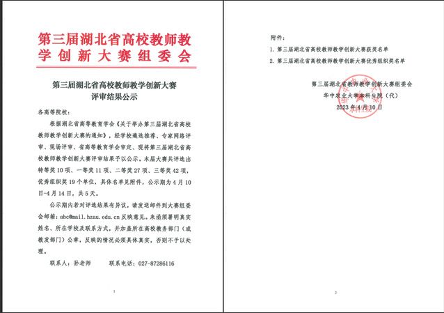 (通讯员 周芸)2023年4月8日,由湖北省教育厅指导、湖北省高等教育学会主办、华中农业大学承办的第三届湖北省高校教师教学创新大赛现场评审在华中农业大学大学顺利落下帷幕。经学校遴选推荐、专家网络评审、现场评审、湖北省高等教育学会审定等环节,4月10日湖北省高等教育学会公示了第三届湖北省高校教师教学创新大赛结果,我院董志华老师主讲的《保险学》课程荣获副高组二等奖。