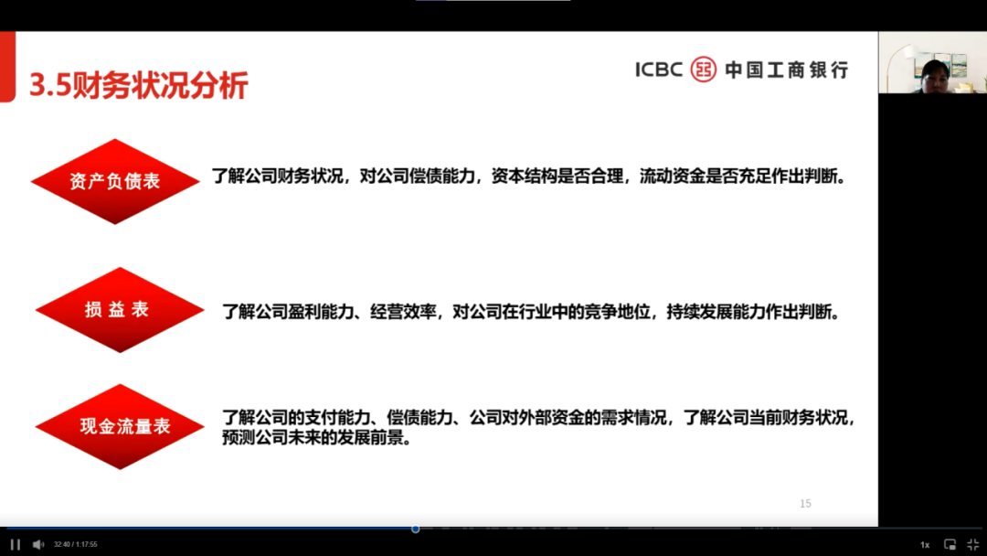 之后,喻青青校友围绕基本逻辑进行展开阐述了公司信贷框架,讲解如何调查得出企业基本情况,股权结构图的正确样式,如何完整表达企业对外投资及关联情况,如何清晰表达企业经营、财务以及偿债、抵质押担保能力情况,如何对市场及行业进行分析,以案例进行了融资用途分析,其中重点讲述了如何通过资产负债表、利润表、现金流量表对企业财务状况进行分析判断。