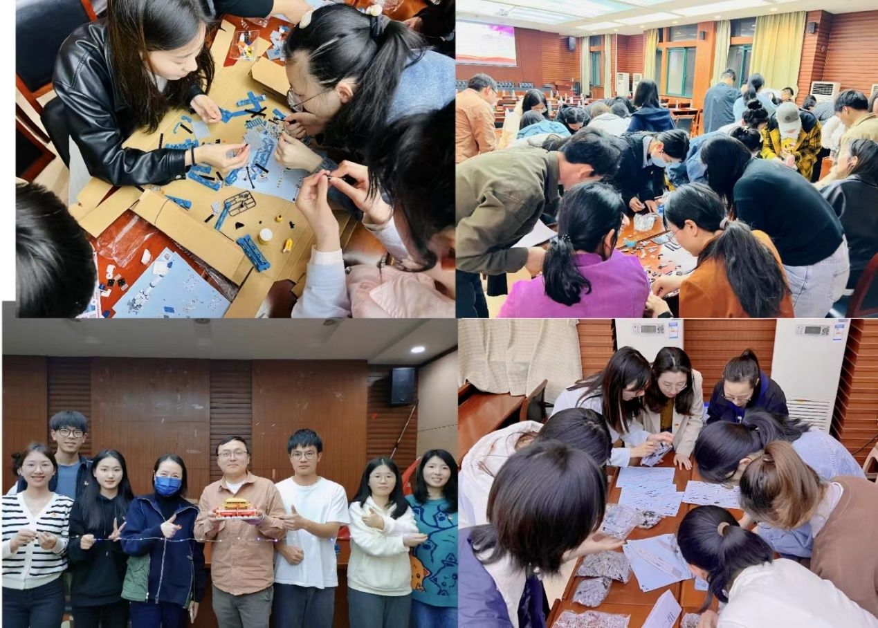 接着,师生党员合作共同完成《天安门》、《航空母舰》、《航空火箭》、《航天航空发射中心》主题模型搭建。各小组有序分工,通过数小时的共同努力,上千块散落的零件被拼成气势恢宏的建筑与航空航母工程。在模型搭建过程中,全体党员体悟到重大设施艰苦而漫长的建设过程,更体会到研发建造者的无限热爱与坚守努力、无私奉献的精神。拼装时,各小组成员激烈讨论、合作完成的过程也提高了党员团队意识、加强了师生党支部间联系。模型拼装完成后,全体党员合影留念。
