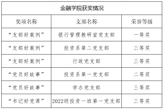 9月25日,学校党委组织部发布《关于第三届“支部好案例、书记好党课、党员好故事”展评活动评审结果的公示》。金融学院在米兰电竞·(中国区)第三届“支部好案例、书记好党课、党员好故事”展评活动中荣获多个奖项(详见下表)。
