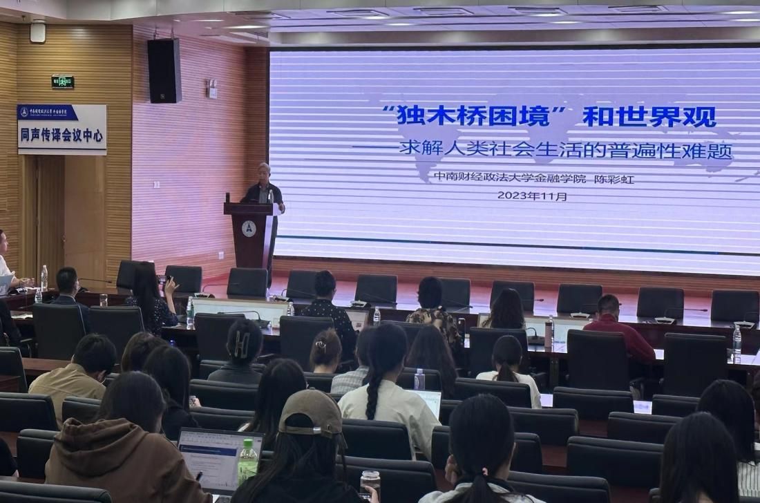 (通讯记者赵翌涵)11月2日下午,彩虹论道第7期讲座在文澴楼同声传译会议室顺利举行。陈彩虹教授为主讲人,主题是《“独木桥困境”和世界观—求解人类社会生活的普遍性难题》,学院师生和校友共100余人参加此次讲座。本期讲座由金融学院党委副书记兼行政副院长李沛主持。