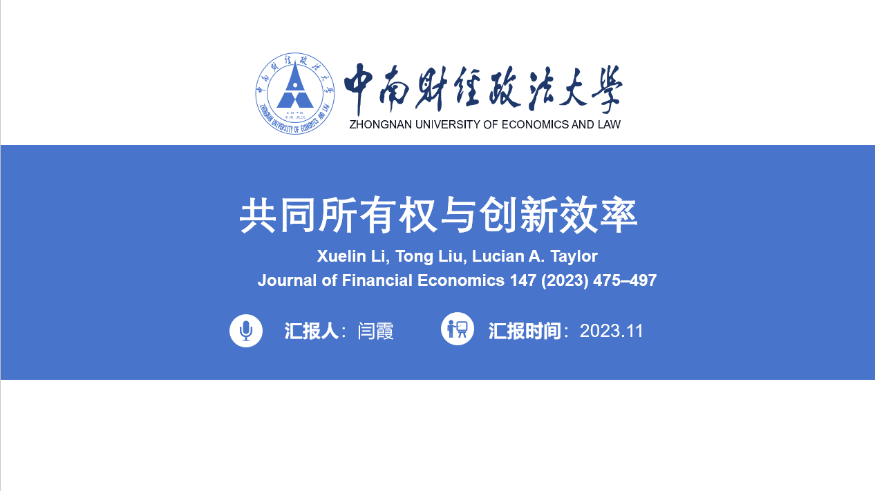 紧接着,研二的闫霞同学分享了来自JFE上的《共同所有权与创新效率》这篇文章。本文以医药行业为例,借助医药独有的分阶段取得研发突破的特点,探究有共同所有权的企业是否会比独立所有者的企业更容易被投资者“掐断”资金支持。