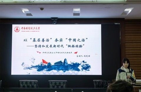 冯爱丽则以“‘基层善治’夯实‘中国之治’——坚持和发展新时代‘枫桥经验’”为题,向大家介绍了“枫桥经验”这一开辟了马克思主义中国化时代化新境界的典型范例。她表示,基层是国家治理的基石,要借鉴并不断发展“枫桥经验”,使基层治理满足时代发展需求,真真做到从历史走向未来。她还勉励大家作为生力军,要扎根于基层社会治理的实践沃土,为推进基层社会治理贡献智慧和力量。