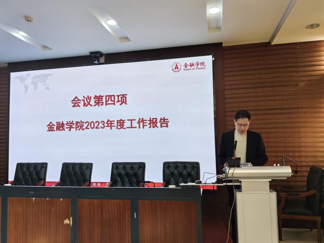 金融学院院长余明桂作金融学院2023年度工作报告。余明桂院长从党建工作、学科建设、本科教学、科学研究、研究生培养、师资队伍建设、学生工作、就业工作、行政管理九个方面回顾了过去一年的工作,同时也指出目前学院所面临的问题和挑战,提出2024年学院的工作思路与展望。余明桂院长指出,2024年是中华人民共和国成立75周年,是实现“十四五”规划目标任务的关键一年,全院师生将坚持以习近平新时代中国特色社会主义思想为指导,全面贯彻落实党的二十大和二十届二中全会精神,在中国式现代化的进程中谢里奋进,开创一流金融学科建设的崭新局面!