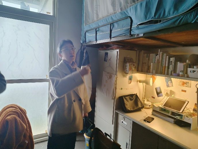 徐惠荣老师十分注重寝室的安全问题。在对寝室卫生环境进行了全面查看后,着重检查了违规电器的使用。卫生保持较好、未使用违规电器的寝室徐老师给予表扬,并希望能够继续保持;同时对于有问题的寝室,徐老师也针对性的提出了整改建议。最后,徐老师提醒同学们,维护宿舍用电安全极其重要,每位同学都应该排查宿舍中的安全隐患,共同维护宿舍的安全与舒适。