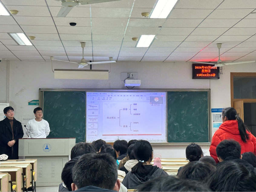 柯希鹏和江永鑫结合自身学习和求职经历,与各位同学,围绕职业选择、专业学习、就业观人生观等话题展开了深入的交流与探讨。