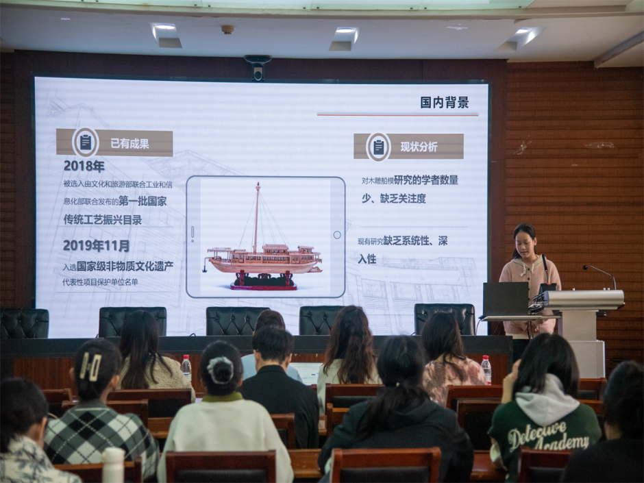 随后,尼加提·雪莲花志愿服务队“返乡”志愿行动专项活动的湖北武汉木蕴乾坤分队上台答辩。实践队就国家级非物质文化遗产——武汉木雕船模的传承现状与发展传播展开了研究,综合使用多种调研方法,实地探访国家级非遗传承人龙从发先生的工作室。针对船模技艺传承与发扬的困境提出了综合性的优化方案。