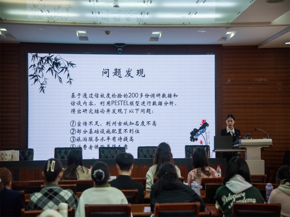 接下来,“融梦”探寻故里文化专项的7支实践队一次上台答辩。湘西苗家歌鼟传唱小分队基于AHP因子分析法,深入湖南省靖州苗族侗族自治县进行实践调研,对苗族歌鼟发展影响因素进行了系统性分析。苏韵茶山刘队针对柳编这一传统技艺在当下日常生活中的价值以及在工业化技术背景下的适应性和创新发展展开研究,提出了关于发扬柳编非遗文化的一系列建议和青年对传承柳编等非遗文化的思考。荆州古城小队开展了文化旅游开发视角下的荆州古城经济效益分析及对策研究,基于通过信效度检验的200多份调研数据和访谈内容,利用PESTEL模型进行数据分析发现了发展中存在的问题,并从供给端和需求端提出了完整的优化方案。