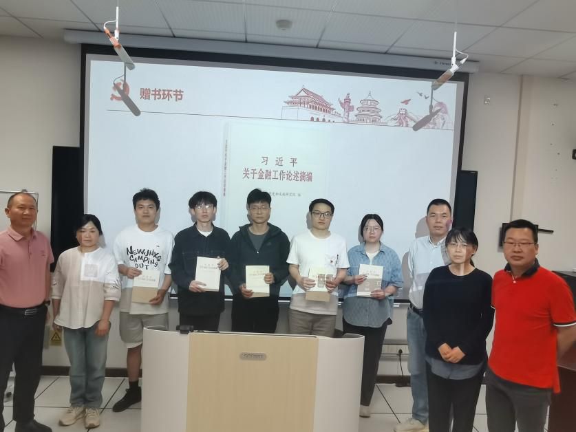 在赠书环节,教师党员向参与本次活动的10名学生党员赠送了书籍《习近平关于金融工作论述摘编》,期盼学生能够更好地了解金融工作内涵,更好地了解当代金融形势、寻找金融学术研究创新点、做一名把人民放在心中的金融学子。