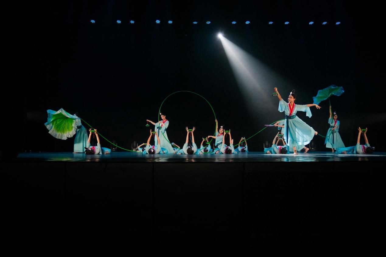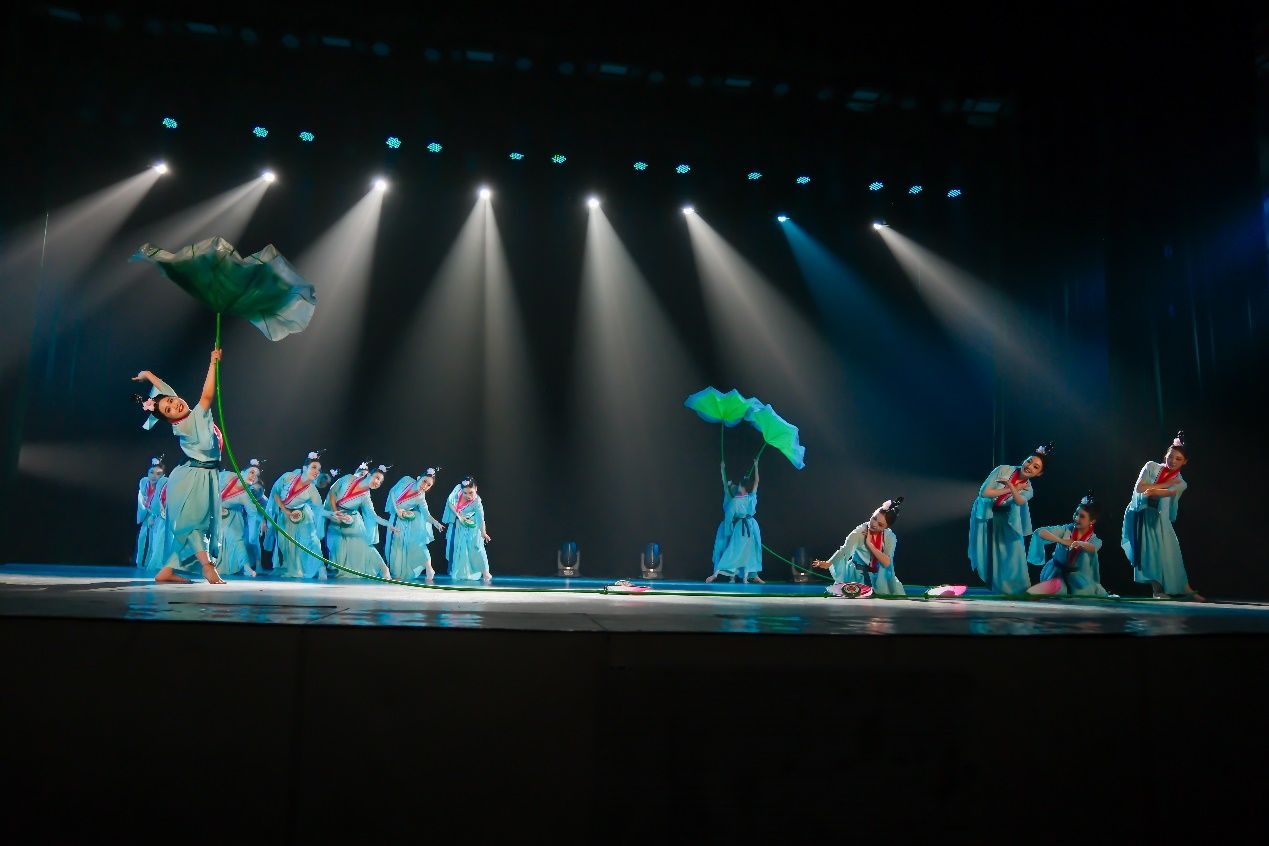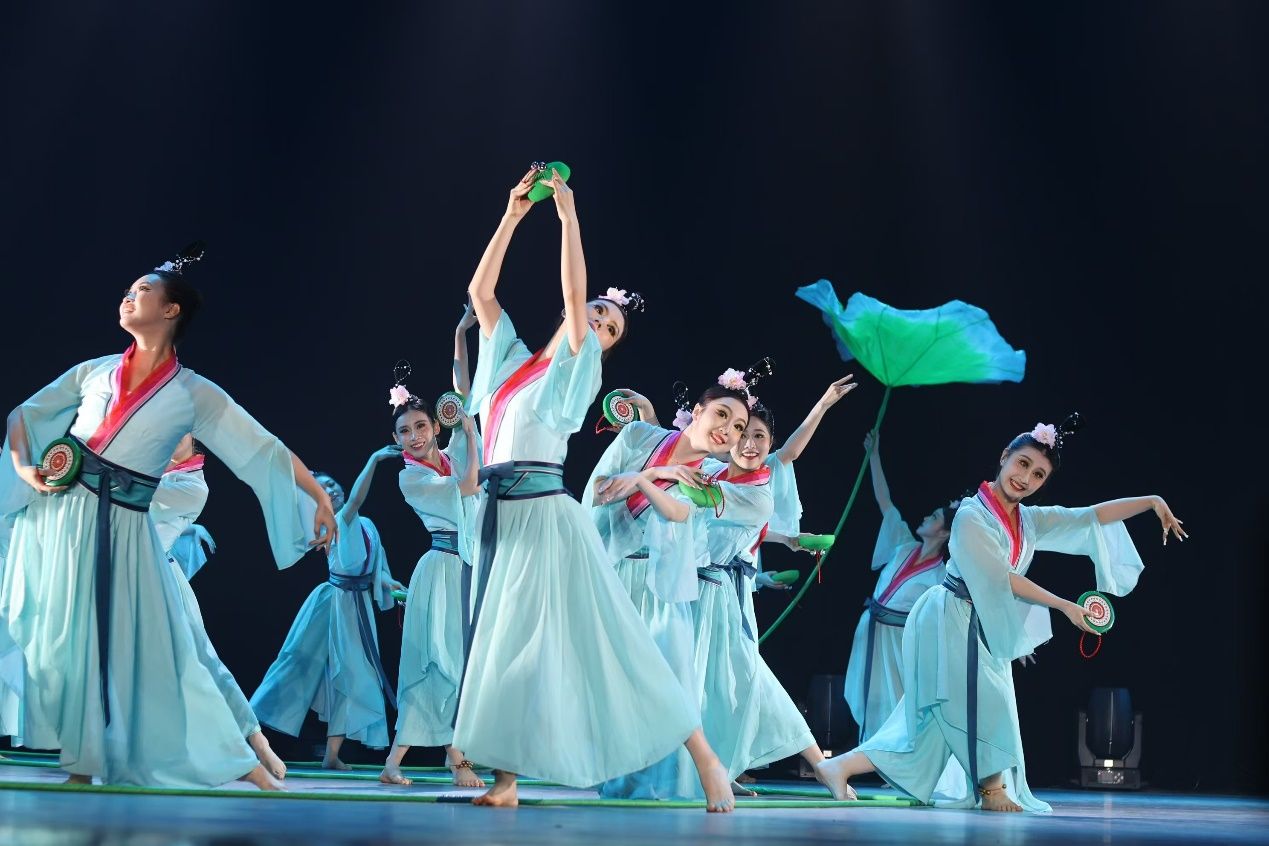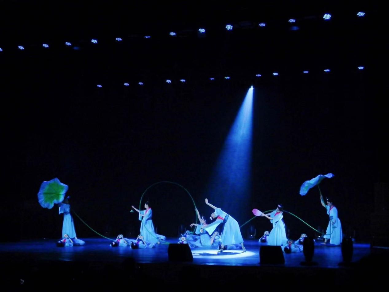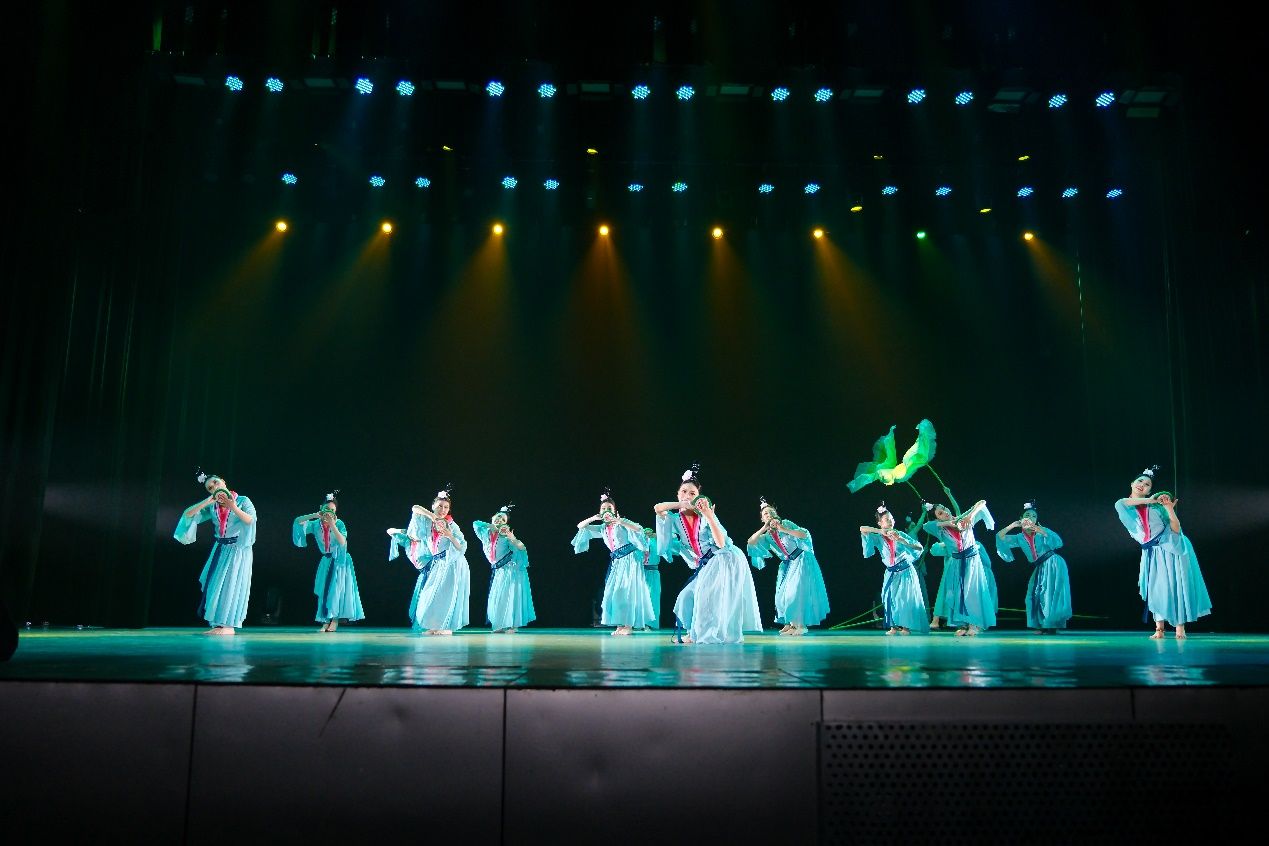 莲叶田田,荷花亭亭,金融学子化身嬉戏欢唱的采莲女, 伴随着悠扬的古乐声,缓缓步入舞台中央。她们手持莲鼓,脚踏旋律,与莲叶同摇曳,与荷花共起舞,“敲击”出了江南水乡的采莲美景。袖若流水清泓,裙如荧光飞舞,我们仿佛置身于江南水乡,领略到“泛水采芙蓉,归来衣更香”的唯美意境。一舞毕,掌声雷动,喝彩不断。灵动的舞姿,飘扬的裙摆,金融舞者们不仅展示了独特的艺术魅力,表现了金融学子的青春活力,更在舞蹈中传递着人与自然和谐共生的主旨情怀。