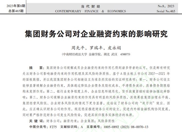 “集团财务公司对企业融资约束的影响研究”基于集团财务公司设立对成员企业造成的外生冲击,利用我国A股主板上市公司2007—2021年的面板数据,构建多时点倾向得分匹配-双重差分模型,研究发现:财务公司设立能够显著缓解企业融资约束,具体通过降低企业债务及股权成本、平滑债务波动、改善债务期限结构来发挥作用;银行业竞争程度上升、企业信息环境恶化、货币政策紧缩时能够加强这种影响。财务公司缓解企业融资约束的效果,在集团治理水平高、集团经营风险低、企业财务风险低的情况下更为显著,这验证了财务公司的“双刃剑”效应。