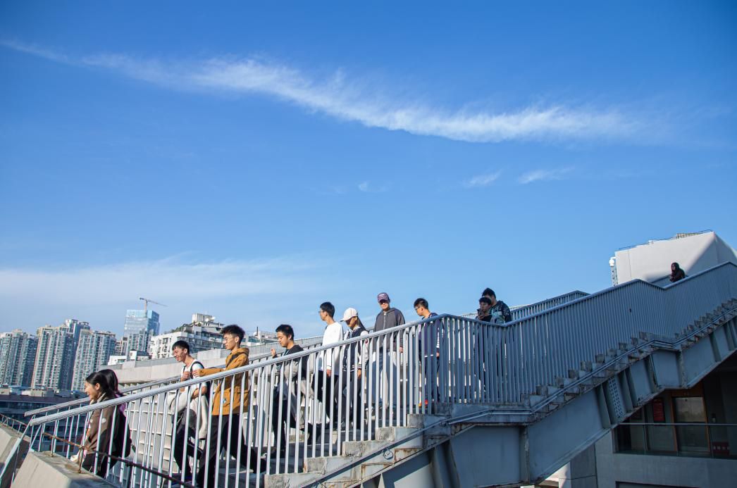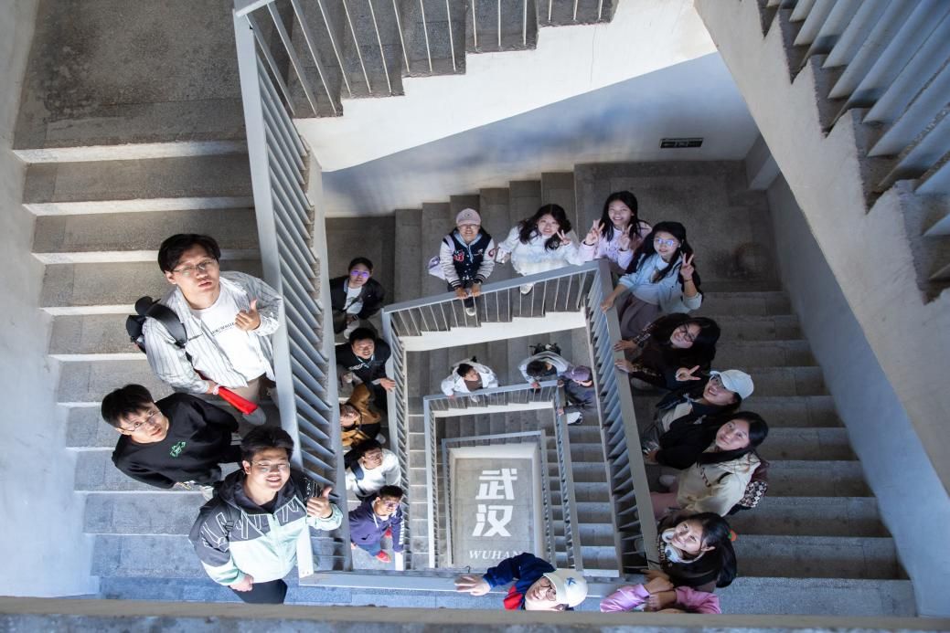 武汉产业投资控股集团党委办公室李艳丽、肖雨对金融学院一行表示热烈欢迎并“自下而上、由表及里”地带领同学们参观空中小镇。武汉亘星园区管理有限公司办公室负责人何亨杰介绍,小镇脱胎于1961年成立的武汉市无线电厂,于2018年10月开园,成为“老厂房+双创”的旧改典范,经过微改造、精提升,变身为文化新地标。园区由7栋4-9层的多层建筑体围合而成,台阶、楼梯、走廊、天桥,相互连接,同学们站在屋顶层做成的天台广场上,一面可以看到汉口老城闹市的烟火气,一面可以看到不远处的轻轨在林立的高楼间穿梭而过;走在楼栋间的空中走廊上,犹如行走在云端,天空触手可及。
