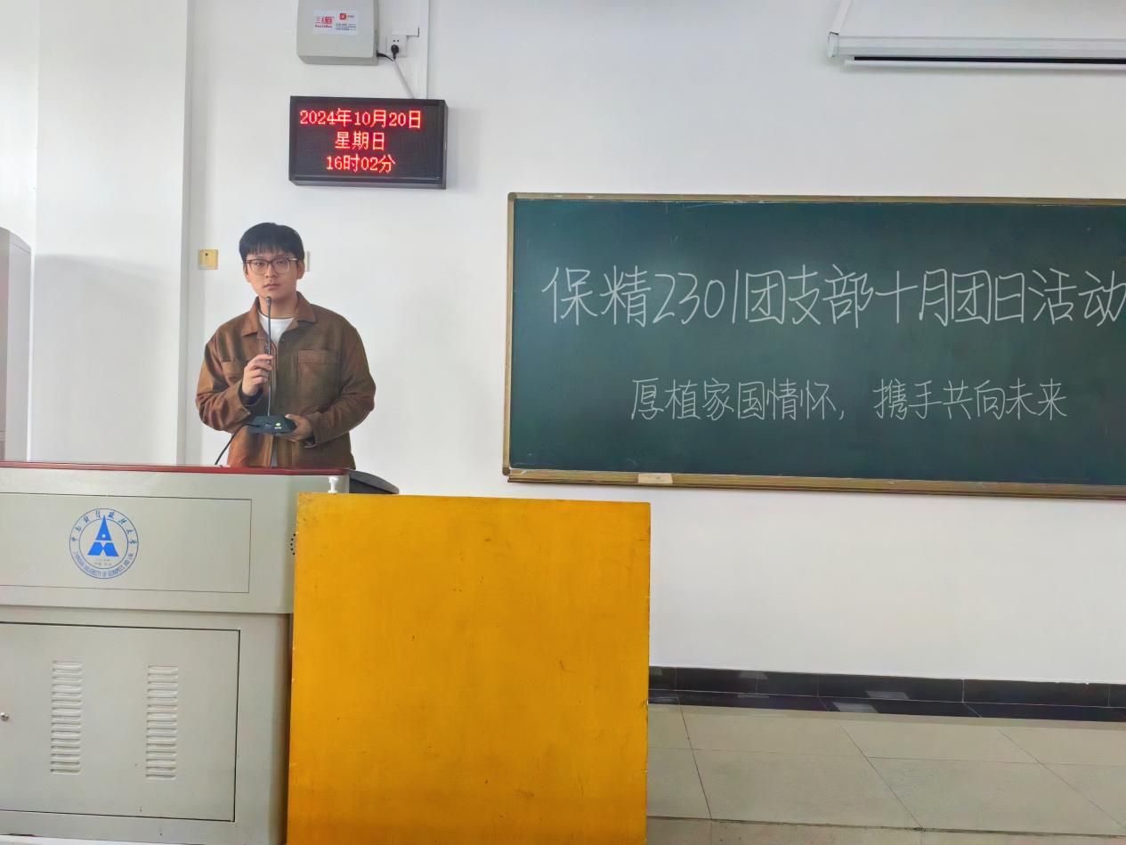(通讯员 霍芸菲 学生记者 何家乐 管俊宇 摄影 沈之寒)党的历史是最生动、最有说服力的教科书,党的光荣传统和优良作风激励着青年坚定信念、凝聚力量。为坚定全体支部成员的使命担当,强化青年团员以知践行的意识,保精2301团支部于10月20日在文澜101教室开展“厚植家国情怀,携手共向未来”主题团日活动。全体人员按时到场,积极参与。