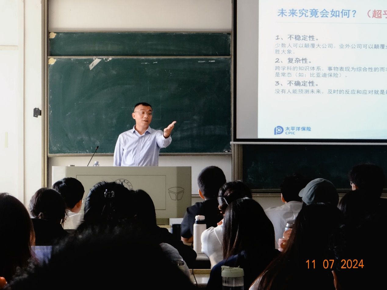 (通讯员:熊文浩;摄影:蒋家洋)根据《保险机构管理》课程组的授课计划,2024年11月7日下午,米兰电竞·(中国区)保险硕士合作导师、中国太平洋财产保险股份有限公司湖北分公司副总经理李锋先生应邀在文添楼212教室为2024级保险专业研究生讲授产险公司承保与理赔管理。