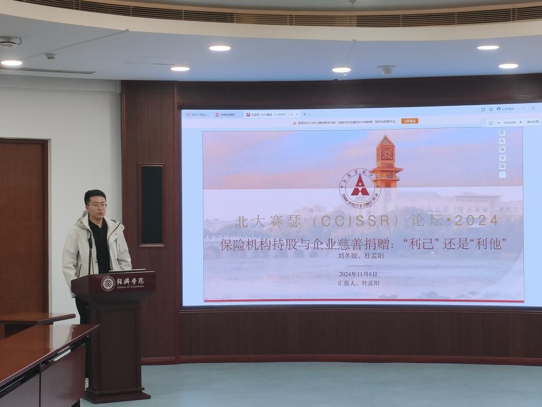 本届论坛的主题是“进一步全面深化改革的目标与路径”。11月8日下午,北大赛瑟论坛“专题学术论坛”举行。本届论坛设立“保险与新质生产力”、“农业保险”、“家庭保险和风险承担”、“巨灾风险和风险态度”、“社会保障”、“医疗保障和普惠保险”、“养老保险和延迟退休”、“保险法律和风险管理”八个学术分论坛。博士生杜孟阳就《保险机构持股与企业慈善捐赠:“利己”还是“利他”》的研究背景、理论分析、研究设计、实证结果、结论和建议等宣讲汇报,并与参会专家和学者深入交流,获得积极评价和中肯建议。