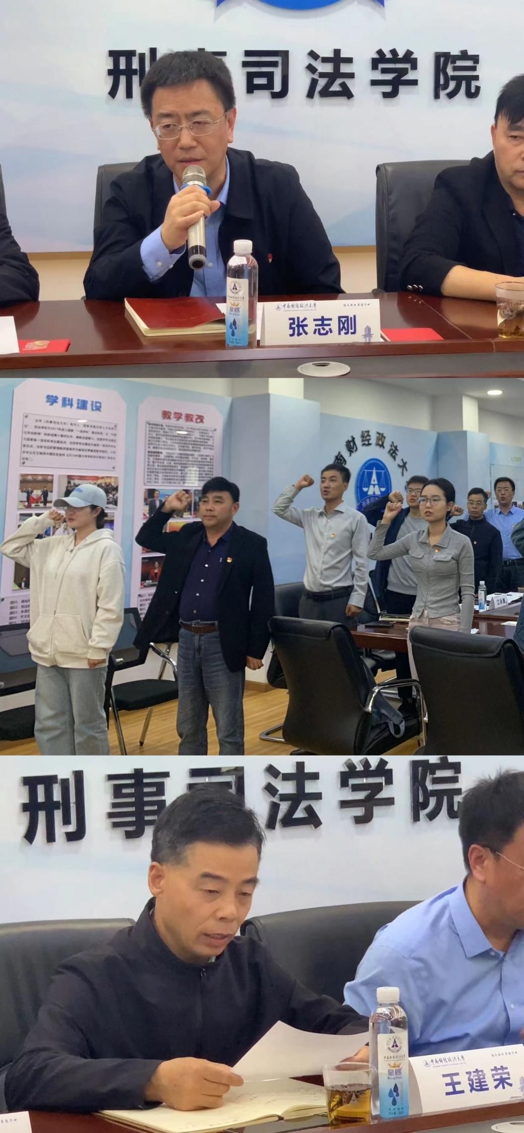 张志刚在致辞中强调要在党建引领下进行学术交流,在党旗的指引下培养“懂经济、通法律、善管理”的复合型人才。汪平带领全体党员重温入党誓词,全体党员高举右手,用庄严的声音,表达不忘初心、牢记使命、永远跟党走的坚定政治信念。王建荣领学了《中国共产党章程》第五章,并指出各支部要切实提升党组织的组织力,突出党支部政治引领作用,提升党建工作实效。