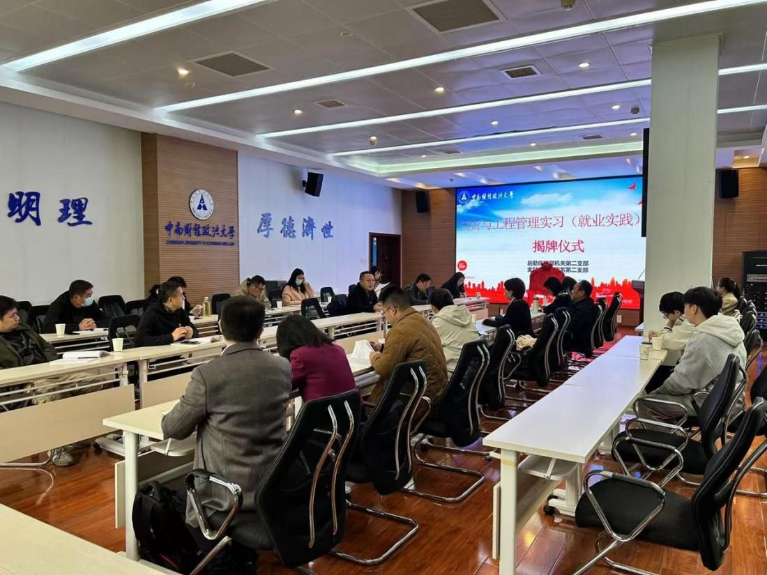 在揭牌仪式中,后勤保障部副部长孙开帆同志介绍了后勤保障部的基本部门构成及其各自的职责,指出实习基地建立有助于提高学校业务与学生就业实践的点对点融合,既提升了学校修缮工程管理专业力量,又为学生提供了实习就业渠道。金融学院党委副书记朱诚蕾指出双方应在共建共育、学生实习就业、理论成果创新等方面开展深入交流,提升党建工作和人才培养质量,实现双方资源共享、优势互补、共赢发展。张东教授详细介绍了我院管工大类学科建设情况,介绍了专业定位及人才培养特色,并期待以基地建设为契机,贯彻产学研的深度融合,提升学生的竞争力水平。学生代表魏慧颖代表第一批实习生进行了宣誓。