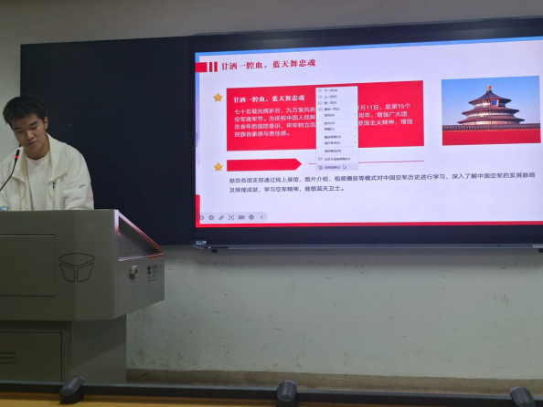 在政治理论学习环节,支部成员叶陆毅深入阐释了“生命至上记心间,安全为先不可偏”的理念。他通过讲解相关内容的PPT,强调生命的宝贵价值,并指出安全是生命的保障。借此,他提醒支部成员们在日常生活中要时刻保有居安思危的思想观念,万事要以安全为重。接着,支部成员叶陆毅以图片和视频的形式向支部成员们展示了中国空军的发展历程——从早期举步维艰的境地到如今筑起了空中的钢铁长城,空军精神中的忠诚、热爱、奉献等内涵深深打动了在场全体支部成员。