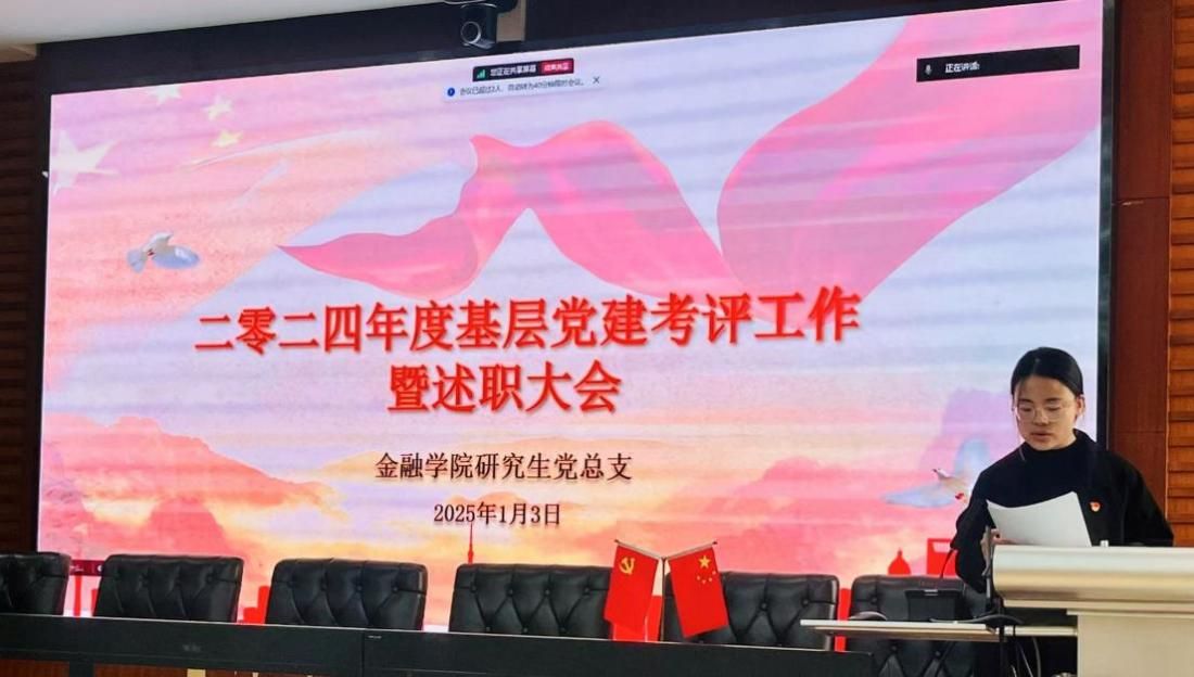 (学生记者:马振涵 谢炜)为坚持和加强党的全面领导,落实管党治党政治责任,进一步推进全面从严治党向基层延伸、向纵深发展,切实增强基层党组织政治功能和组织功能。2025年1月3日上午,金融学院研究生党总支在文泉楼南313室组织召开研究生党支部年度述职会议,学院研工办主任王秀景、研究生党总支副书记郭东、研究生辅导员杨雅婷、汪子昂及各研究生党支部书记参加本次会议。会议由研究生党总支宣传委员王新然同志主持。
