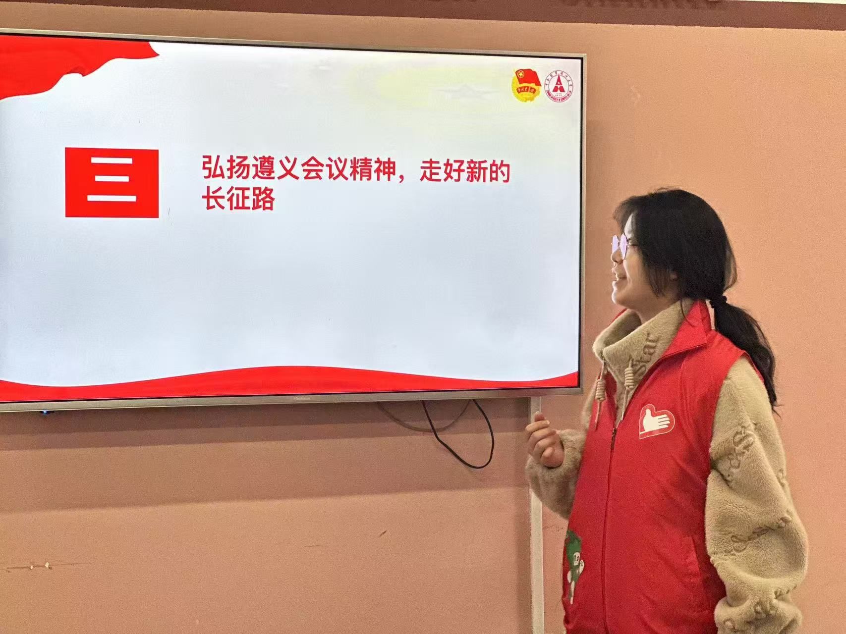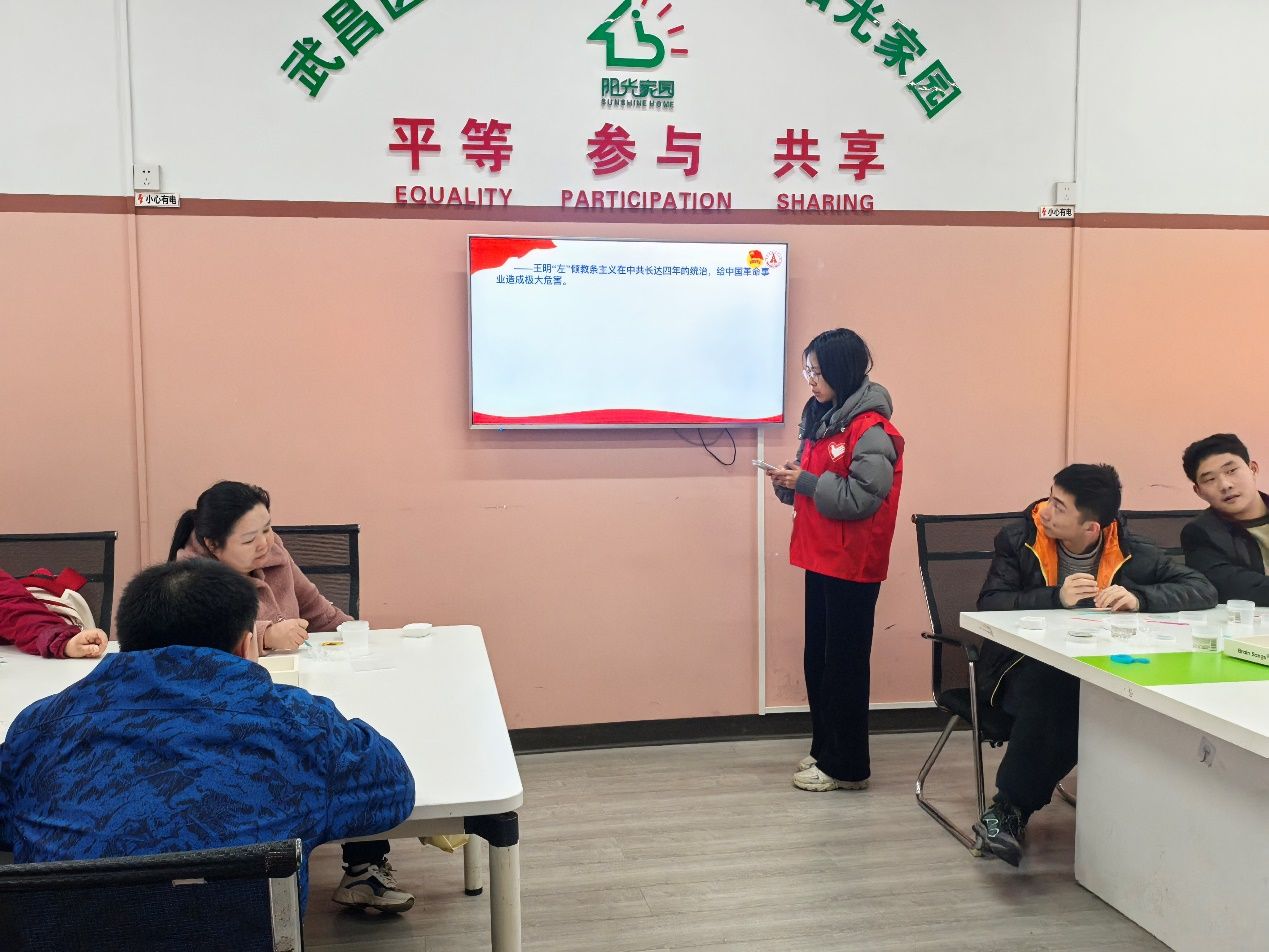 随后,志愿者通过PPT展示用通俗易懂的语言向社区成员介绍了有关遵义会议的内容。从通道会议再到遵义会议,会议议题日益深化,党中央在此过程中不断汲取历史经验教训。最终,在遵义会议上,全党思想得以统一,遵义会议也因此成为了中国历史上的一个重要转折点。