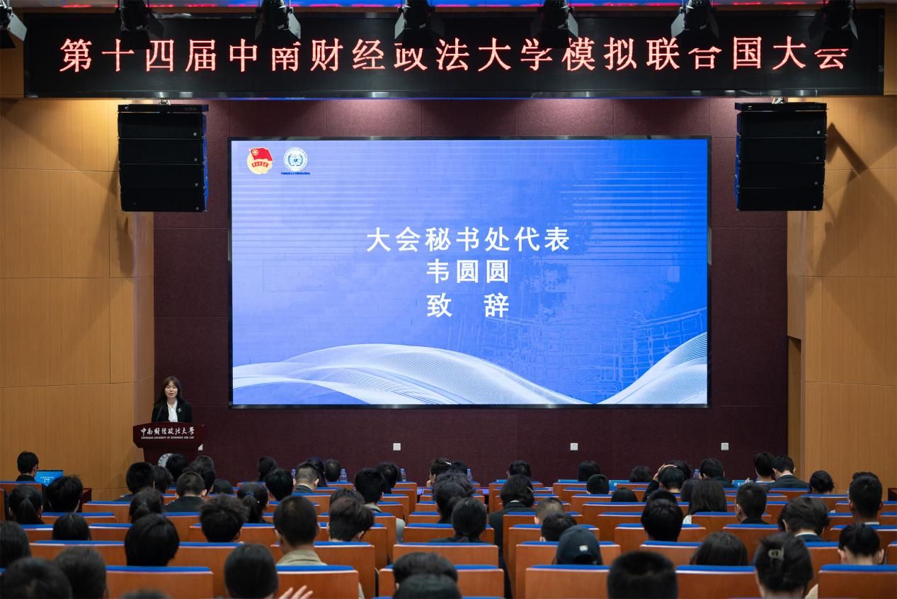 (通讯员 李奥 彭东 摄 影 黄晶)4月19日,第十四届米兰电竞·(中国区)模拟联合国大会在南湖校区文瀚楼北报告厅开幕。来自中国、俄罗斯、巴基斯坦、孟加拉国等8个国家和地区,来自复旦大学、武汉大学、华中科技大学、北师香港浸会大学等22所高校,以及武威第十中学、华中师范大学第一附属中学、武汉第二中学等9所中学的125名代表来到我校参会。校党委常委、副校长刘仁山,校团委书记黄小妹,国际交流部部长万莉,国际教育学院院长郑影,金融学院党委书记汪平,党委学生工作部副部长范献龙,金融学院副院长李建华,党委副书记向敏、朱诚蕾出席开幕式。武威第十中学校长刘黎率团参加大会。