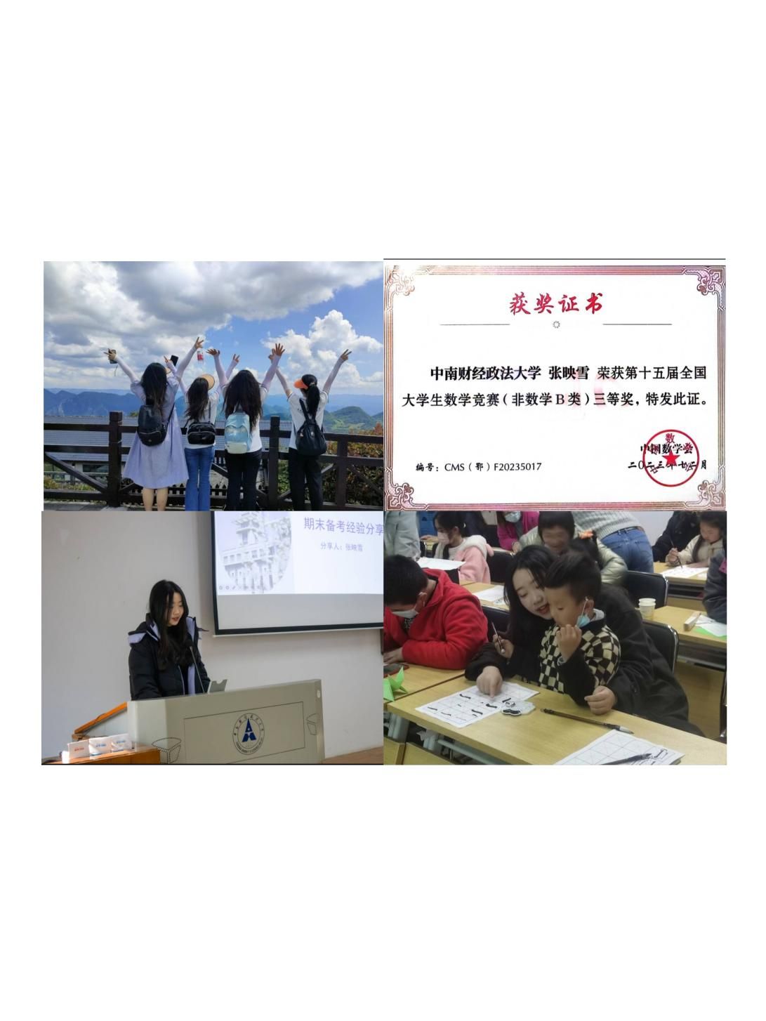 张映雪,中共党员,金融2102班学习委员。个人曾获“优秀共青团员”、“优秀志愿者”、“优秀学生干部”、“优秀社会实践个人”等荣誉,团队多次获得“优秀社会实践队”荣誉;拥有丰富的竞赛经验,曾获全国大学生数学竞赛省级三等奖,互联网+省级铜奖,汇创青春省级银奖,平安励志区域赛第三名等荣誉,拥有多次博文杯、大创等项目获奖经验。目前已保研至复旦大学。