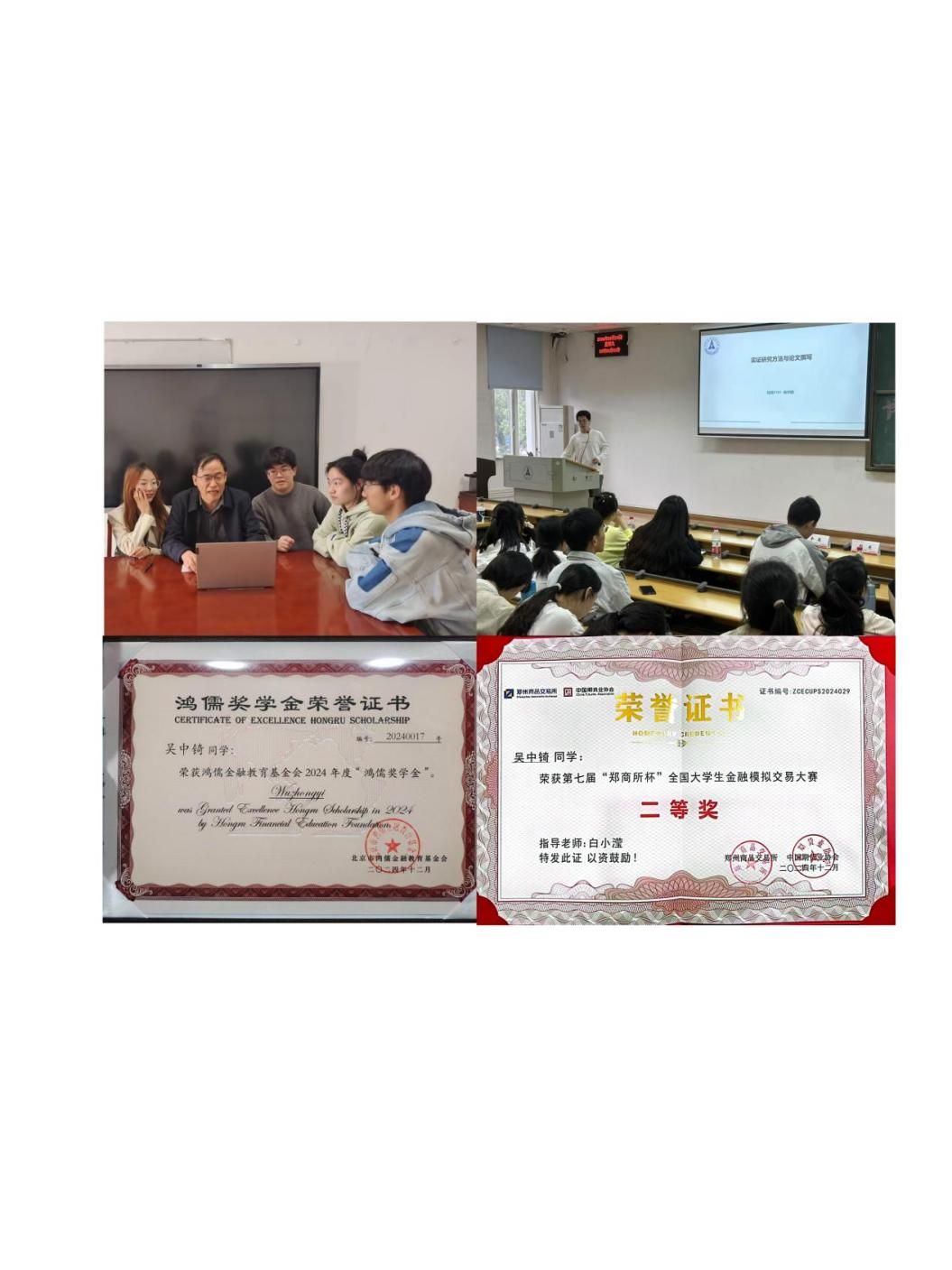 吴中锜,投资2101班,中共预备党员。曾获鸿儒奖学金、周骏奖学金、一等奖学金;本科期间发表SCI一篇,工作论文入围中国经济学年会、未来经济学家论坛、全国高校本科生经济学年会宣讲;曾获郑商所杯国家级二、三等奖,大创国家级立项,三创赛省级一等奖,能源经济学术大赛省级二等奖等奖项。曾任班长,A股分析协会副团长,获评“社会实践先进个人”“社团活动先进个人”等荣誉称号。
