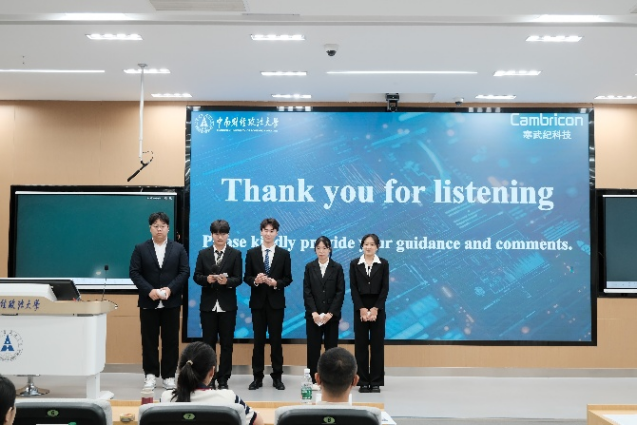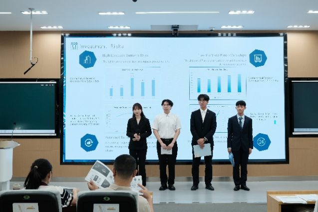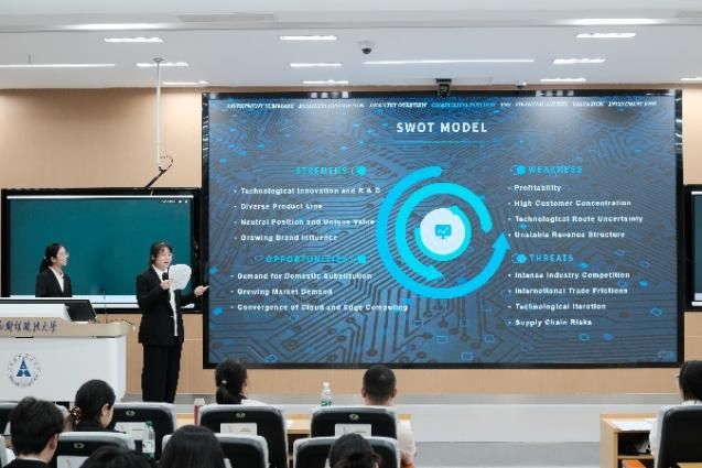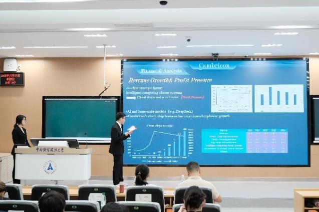 比赛正式开始,六支队伍按抽签顺序依次进行答辩。场上比赛激烈地进行,选手们自信从容的答辩、评委们专业详实的提问都给现场观众留下了深刻印象,真是一场巅峰对决!六组选手主要围绕“中科寒武纪公司” 的财务分析、投资决策、公司治理等方向展开研究分析,呈现出极高的专业素养。评委老师们对每一组的表现进行了精准点评,既指出优点也点明不足,并针对性地提出关键问题。