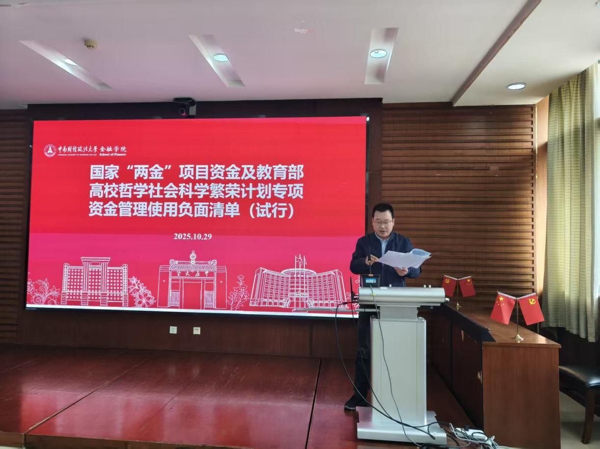 (通讯员 苏婉妹)2025年10月29日下午,金融学院在文泉楼南313会议室召开全体教职工大会,集中学习科研经费使用管理规定并开展警示教育。会议由学院副院长李建华主持,学院领导班子成员及教职工参加了会议。