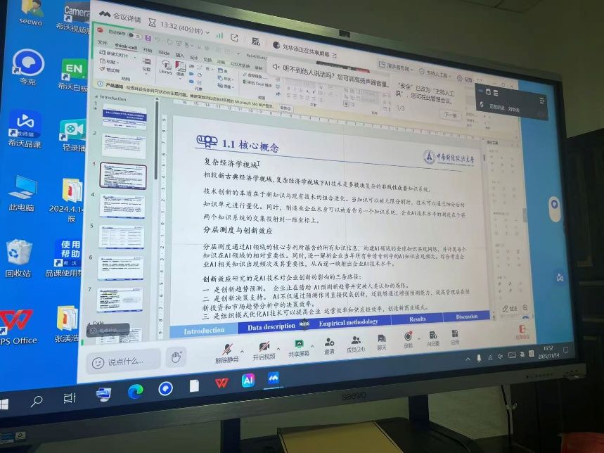 组会上,陈远娇与刘华添两位同学分别就《创新质量信号、权利稳定性与技术交易——来自专利无效宣告审查决定的经验证据》和《企业人工智能技术水平的分层测度及其创新效应——基于全球知识网络视角》两篇前沿文献进行了系统汇报。他们不仅深入阐释了文献的核心概念、研究框架、理论机制与实证分析,还基于原文附件的数据与程序进行了Stata复现,对结果进行了解读。