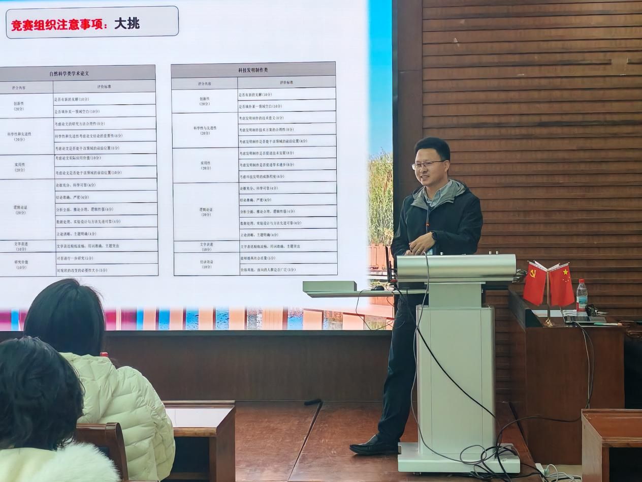随后,校团委熊灯副书记带来权威分享。他围绕“中国国际大学生创新大赛”“挑战杯”等重要赛事,深入解读最新政策导向、评审核心风向,并结合多年指导经验给出实用备赛策略,为在场学子厘清赛事脉络、明确备赛方向,赢得阵阵掌声。
